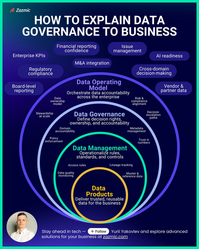 Here we have Yurii’s breakdown of Products ➡️ Management ➡️ Governance ➡️ Operating Model, which is a great way to visualise the scaffolding he mentions. It moves from the tangible aspects the business sees (the Product) down to the bits which business teams don’t want to know about, which keeps it from breaking (the Operating Model).